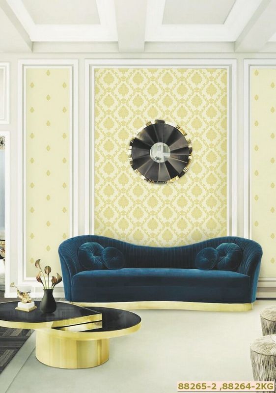 Mẫu giấy dán tường 88265-3 là sự kết hợp giữa hoa văn màu vàng trên nền giấy màu xanh cực kỳ nổi bật