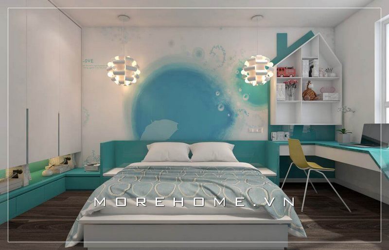Thiết kế giường ngủ trẻ em phong cách hiện đại, tab đầu giường màu trắng liền kề tạo điểm nhấn nổi bật, ấn tượng