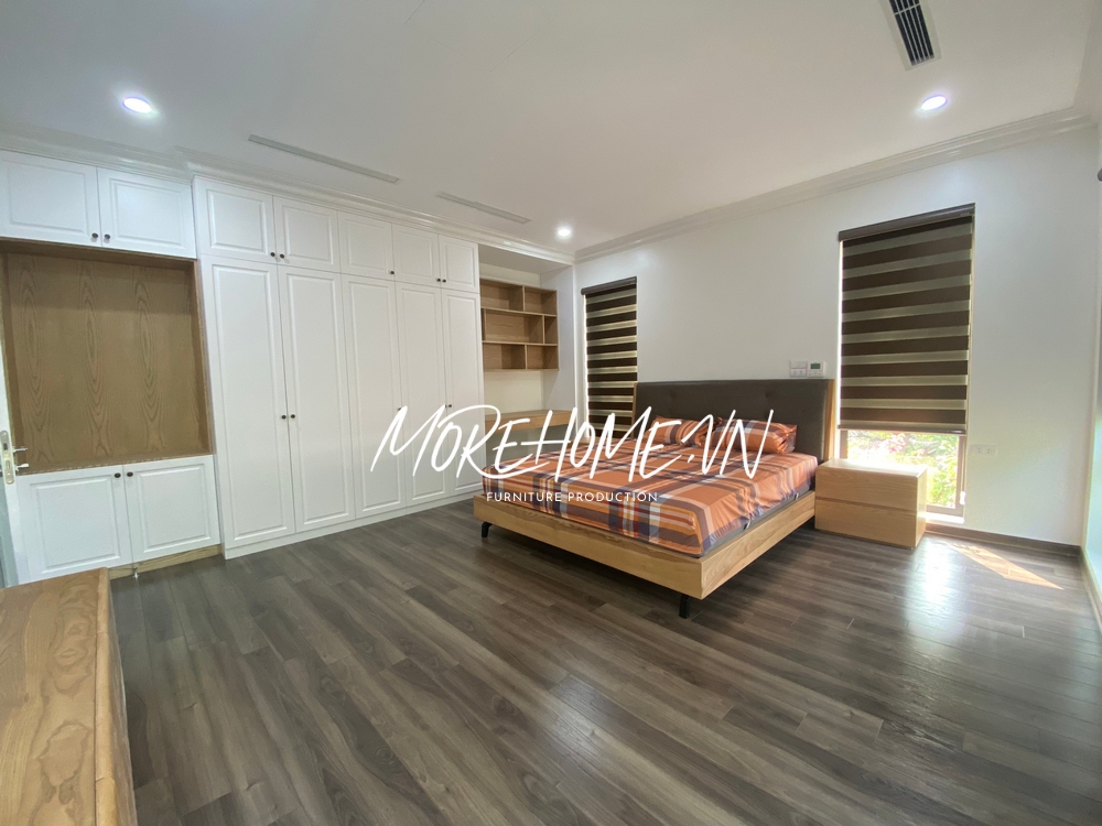 Morehome đã thực hiện hình ảnh công trình thi công giường ngủ gỗ tự nhiên tân cổ điển với phun sơn màu trắng đẹp.